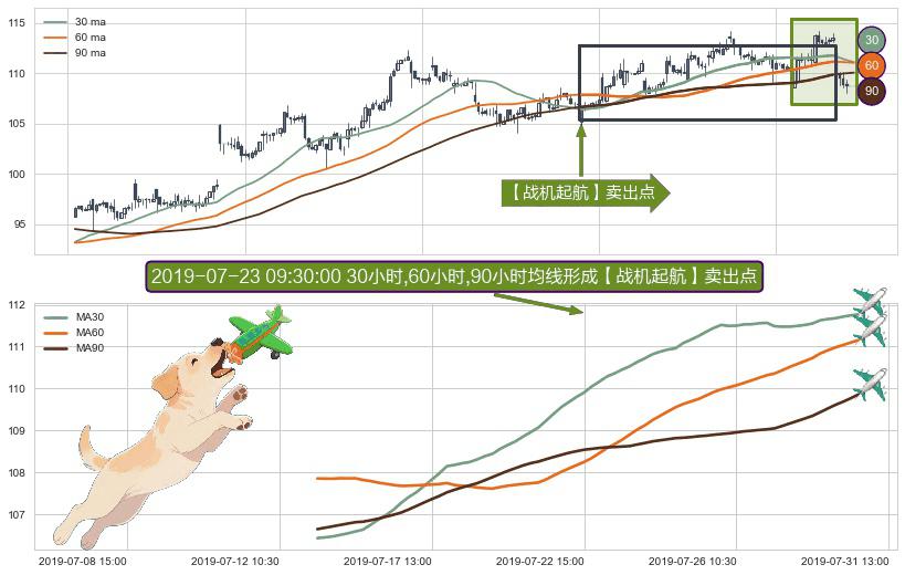 ⚀ 2019-07-15 09:30:00小时-2019-07-30 15:00:00小时显现 30小时-60小时-90小时均线 【战机起航】卖出点 看空信号,后市看跌,卖出