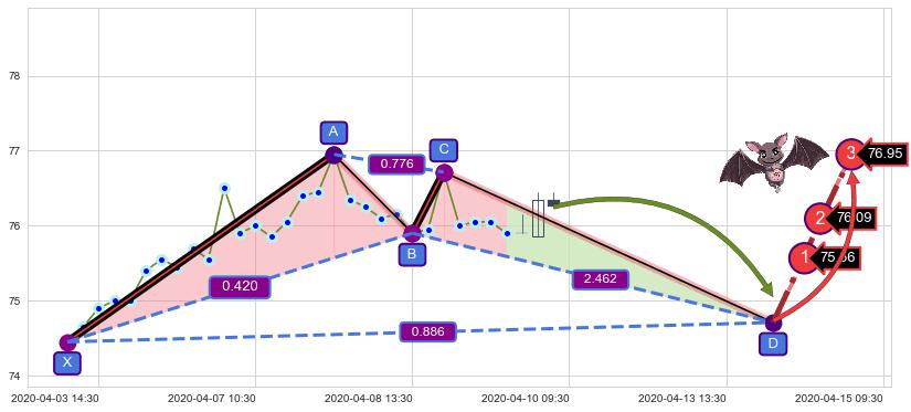 ➣ 未完成【蝙蝠】形态起点X: 04-03:12, 已到达C点: 04-08:15, 预测最终D点: 04-14:10, 共43交易小时