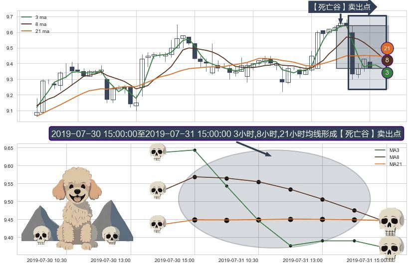 ⚀ 2019-07-31 09:30:00-小时至2019-07-31 15:00:00-小时显现 3小时-8小时-21小时均线 【死亡谷】卖出点 看空信号,后市看跌,卖出