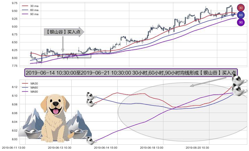 ⚀ 2019-06-14 11:30:00-小时至2019-06-21 10:30:00-小时显现 30小时-60小时-90小时均线 【银山谷】买入点 看多信号,后市看涨,买入