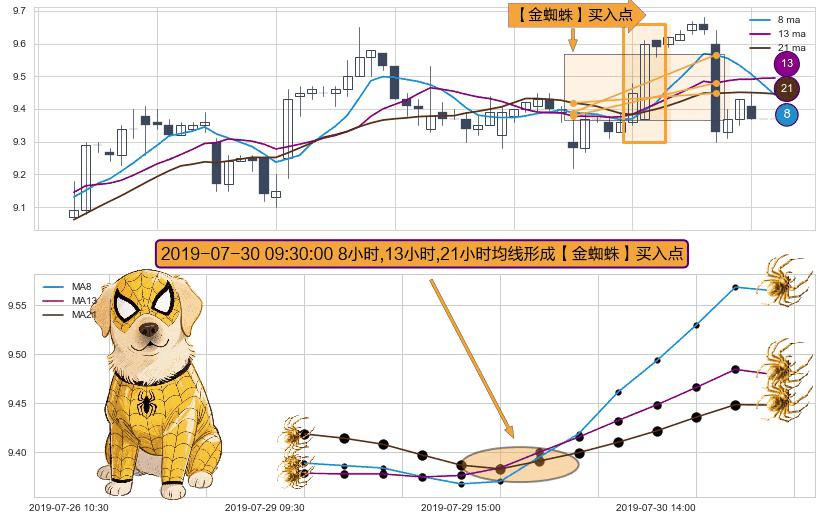 ⚀ 2019-07-30 09:30:00小时显现 8小时-13小时-21小时均线 【金蜘蛛】买入点 看多信号,后市看涨,买入