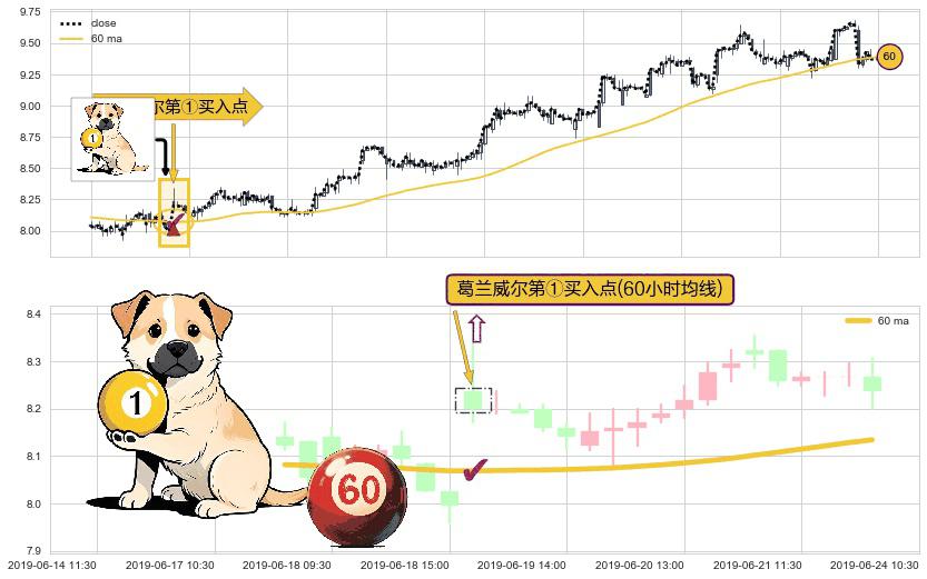 ⚀ 2019-06-19 09:30:00-小时显现 葛兰威尔均线 60小时均线 第买①入点 走势反转见底信号,后市看涨,买进信号