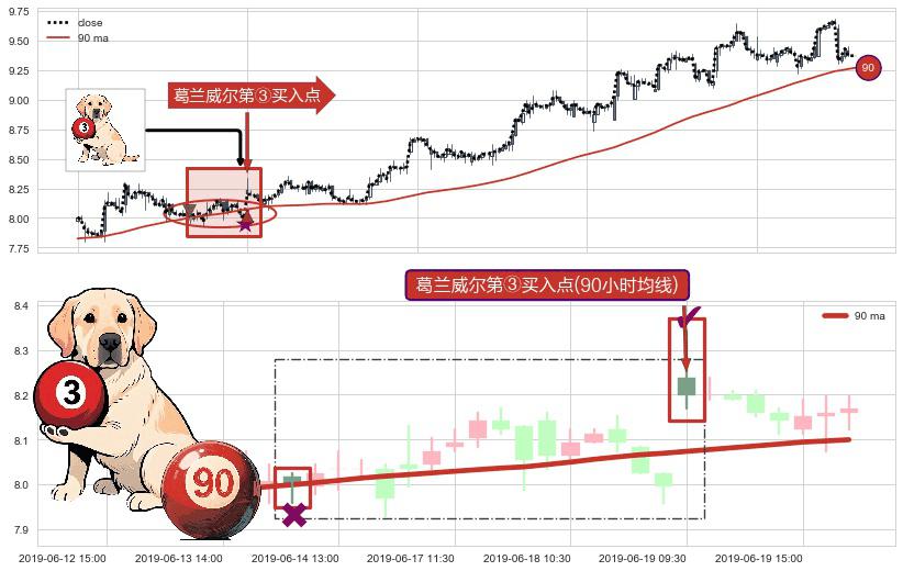 ⚀ 2019-06-19 09:30:00-小时显现 葛兰威尔均线 90小时均线 第③买入点 上升趋势的中继信号,后市看涨,买进信号