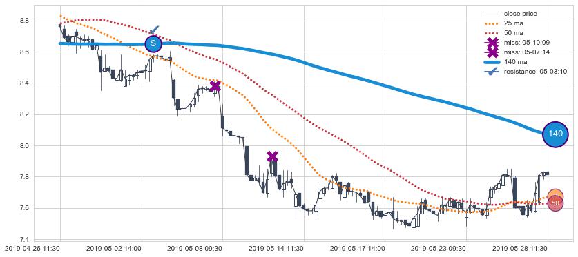 ⚀ 2019-07-24 10:30:00-小时显现 葛兰威尔均线 240小时均线 第⑤卖出点 上升趋势均值回复的短线回落信号,后市看跌,卖出信号