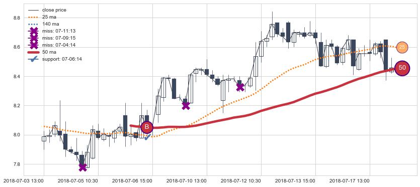 ⚅ 买点向上突破均线后,价格走势很纠结,不断在均线周围试探,有再次下探破位均线的可能
