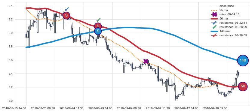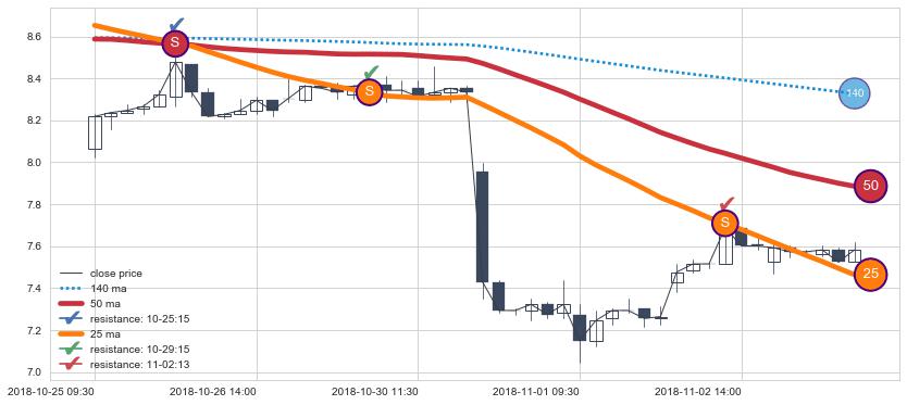 ➢ 最优均线组合共正确确认支撑阻力信号15处,正确确认率 60.00%
