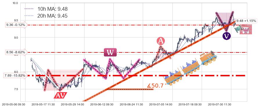 🍖 长线趋势跟踪组合短线均值回复[强支撑信号]2019-05-20 14:00-2019-07-31 15:00上升趋势依然成立(上涨趋势跟踪依然可行),短线价格略微下行回调(均值回复猜想),即将接近趋势提供的未破位的支撑价格:9.48。