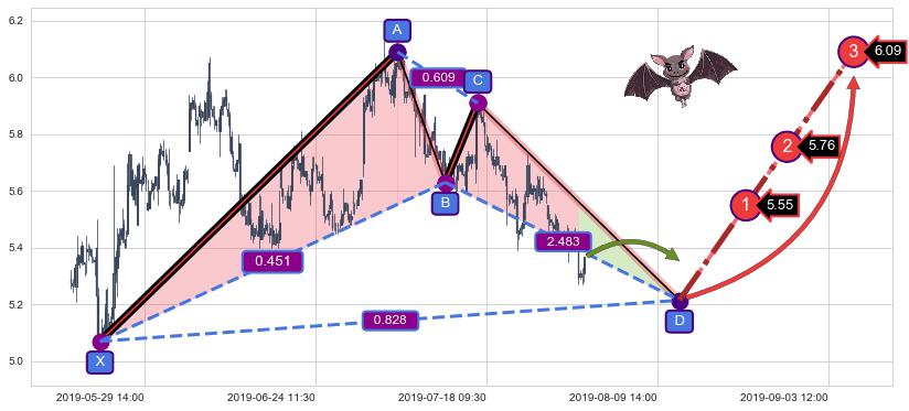 ➢ 接近预测D点位置, 随时警戒看涨【蝙蝠】形态反转启动