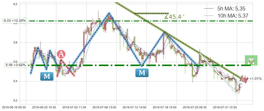 ♘ 阻力价格位5.56,可信任强度87.04%,距离最后交易2019-07-31 15:00形成的收盘价格5.37相差 +3.62%