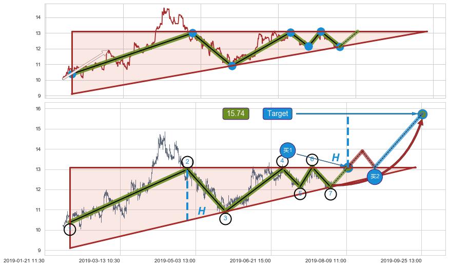 ➢ 最小中继整理涨幅→𝐇: 2.614 (𝐇楔型旗杆的长度:楔型起点→顶点)