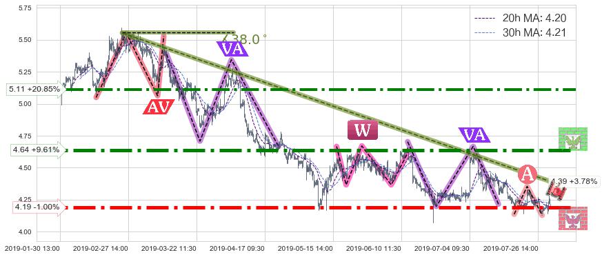 ♘ 支撑价格位4.19,可信任强度91.17%,距离最后交易2019-07-31 15:00形成的收盘价格4.23相差 -1.00%