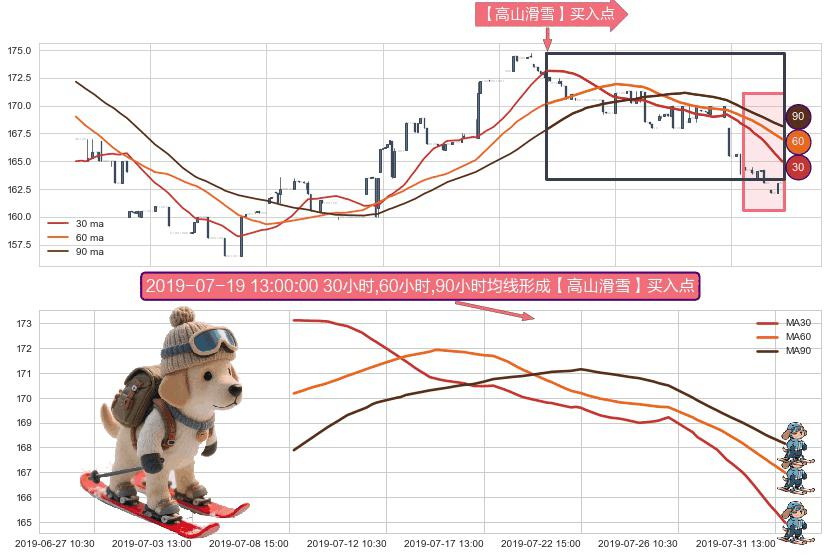 形态多维评估: ⚀ 2019-07-09 09:30:00小时-2019-07-31 15:00:00小时显现 30小时-60小时-90小时均线 【高山滑雪】买入点 看多信号,后市看涨,买入