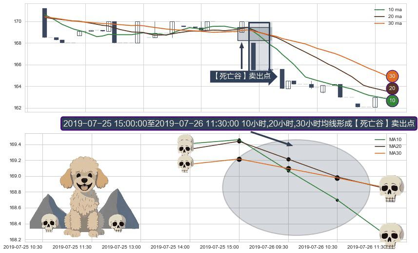 形态多维评估: ⚀ 2019-07-26 09:30:00-小时至2019-07-26 11:30:00-小时显现 10小时-20小时-30小时均线 【死亡谷】卖出点 看空信号,后市看跌,卖出