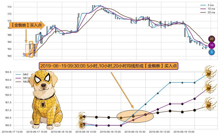 形态多维评估: ⚀ 2019-06-19 09:30:00小时显现 5小时-10小时-20小时均线 【金蜘蛛】买入点 看多信号,后市看涨,买入