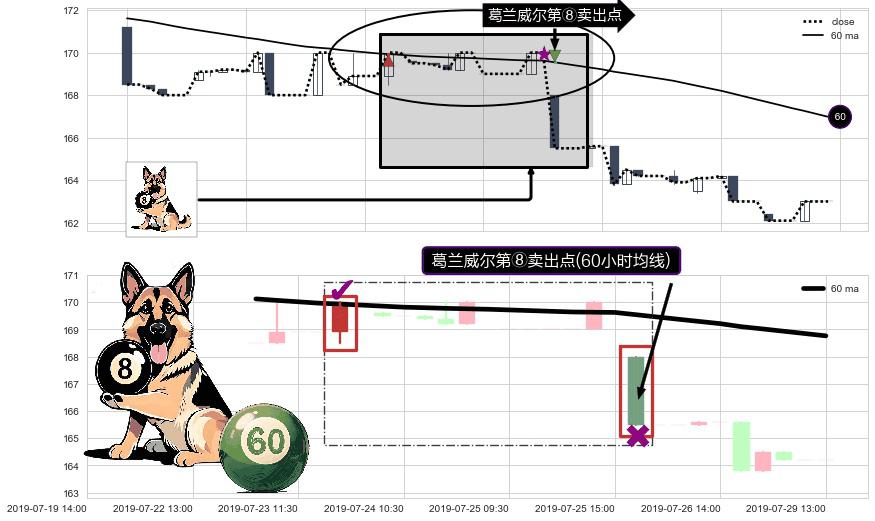 形态多维评估: ⚀ 2019-07-26 09:30:00-小时显现 葛兰威尔均线 60小时均线 第⑧卖出点 下降趋势的中继信号,后市看跌,卖出信号