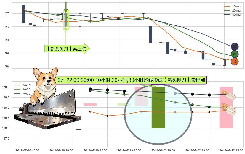 形态多维评估: ⚀ 2019-07-22 09:30:00小时显现 10小时-20小时-30小时均线 【断头铡刀】卖出点 看空信号,后市看跌,卖出