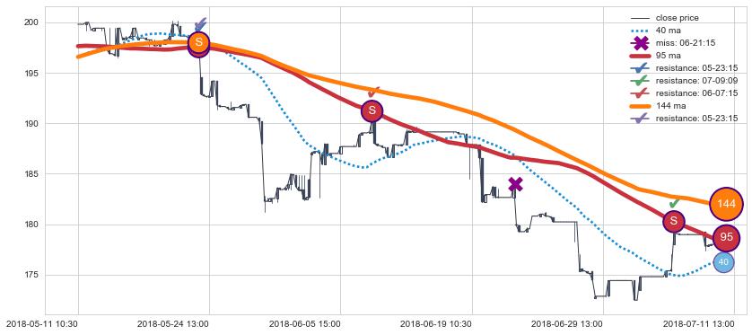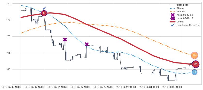 下跌趋势05-11 10:30-07-11 13:00,均线144, 95确认关键阻力3处