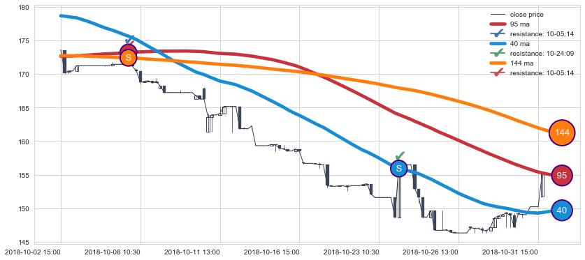 下跌趋势10-02 15:00-11-01 13:00,均线40, 144, 95确认关键阻力2处