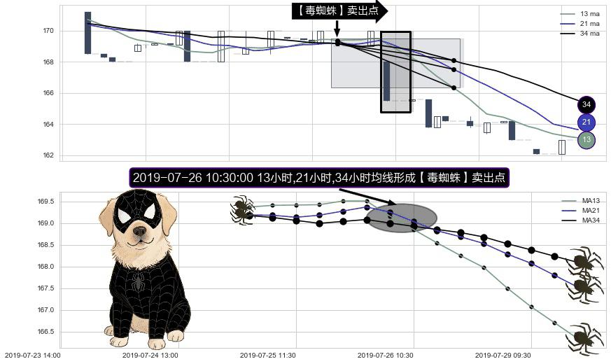形态多维评估: ⚀ 2019-07-26 10:30:00小时显现 13小时-21小时-34小时均线 【毒蜘蛛】卖出点 看空信号,后市看跌,卖出
