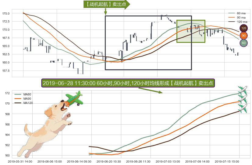 形态多维评估: ⚀ 2019-06-13 14:00:00小时-2019-07-15 15:00:00小时显现 60小时-90小时-120小时均线 【战机起航】卖出点 看空信号,后市看跌,卖出