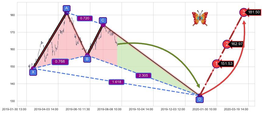 ➢ 距离预测D点位置有足够的下跌空间, 与看涨【蝴蝶】形态相反,实际方向【看跌】
