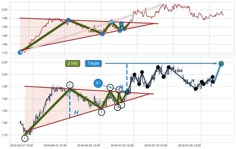 ➢ 最小中继整理涨幅→𝐇: 0.119167 (高点逐步降低斜边第一阻力点②与支撑边垂直距离)
