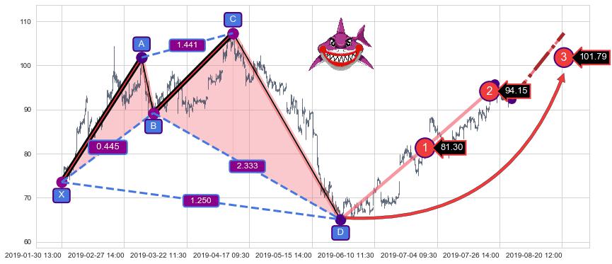 ➣ 已完成【鲨鱼】形态起点X: 01-30:13, 终点D: 05-27:11, 共447交易小时