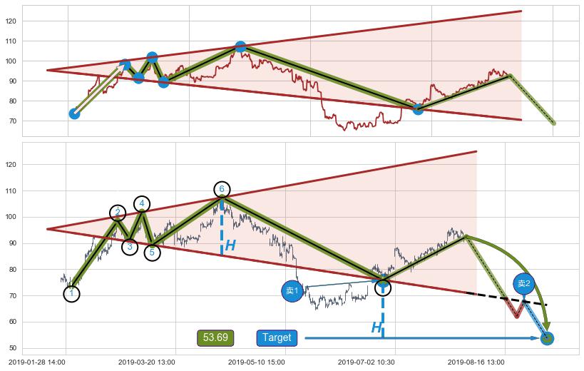 ➢ 最小反转跌幅→𝐇: 22.16 (逐步抬高阻力斜边最后的阻力点⑥与支撑边垂直距离)