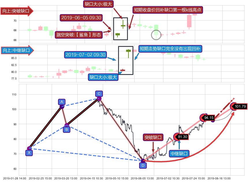 ➣ 跳空后首先朝【突破反向回撤】方向,之后缺口再次起到影响朝【突破目标达成】方向