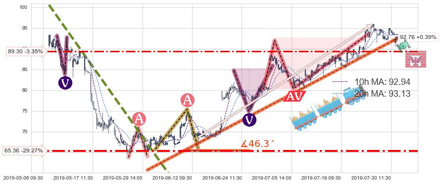 🍖 长线趋势跟踪组合短线均值回复[强支撑信号]2019-05-30 13:00-2019-07-30 15:00上升趋势依然成立(上涨趋势跟踪依然可行),短线价格略微下行回调(均值回复猜想),即将接近趋势提供的未破位的支撑价格:92.76。