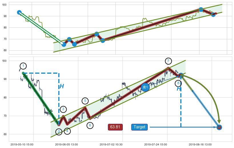 从2019-05-30 13:00至2019-06-13 09:30,共包含52个小时,阶段股价上涨5.17%,阶段股价变动位移路程比: 1 : 8