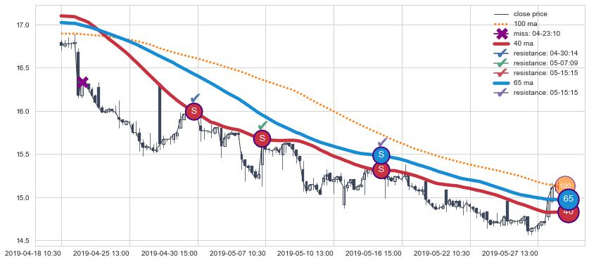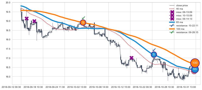 下跌趋势04-18 10:30-05-28 13:00,均线40, 65确认关键阻力3处