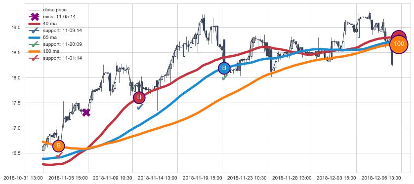 上涨趋势10-31 13:00-12-06 13:00,均线40, 65, 100确认关键支撑3处