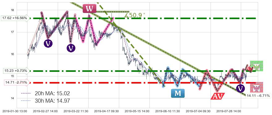 ♘ 阻力价格位15.23,可信任强度87.91%,距离最后交易2019-07-31 15:00形成的收盘价格15.12相差 +0.73%