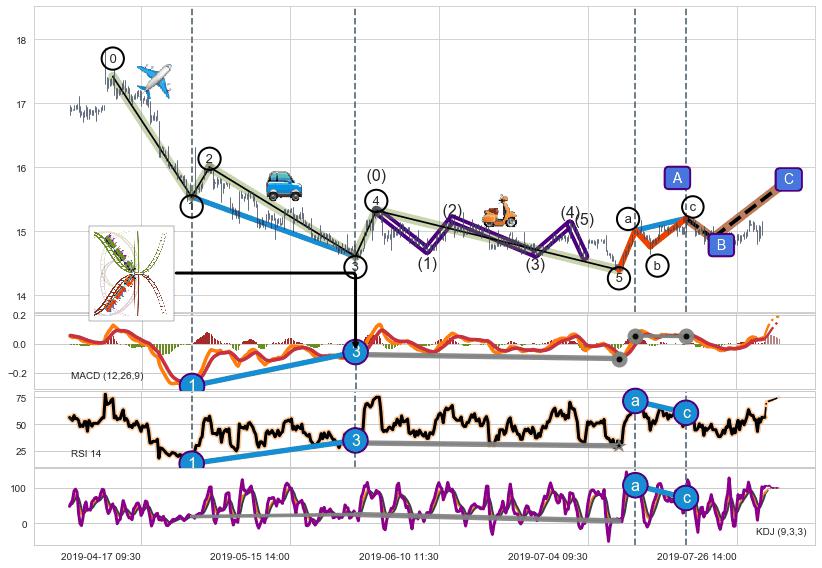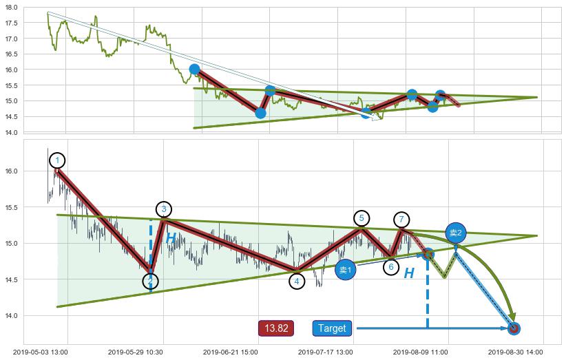 从2019-01-30 14:00至2019-02-14 15:00,共包含47个小时,阶段股价上涨9.81%,阶段股价变动位移路程比: 1 : 2