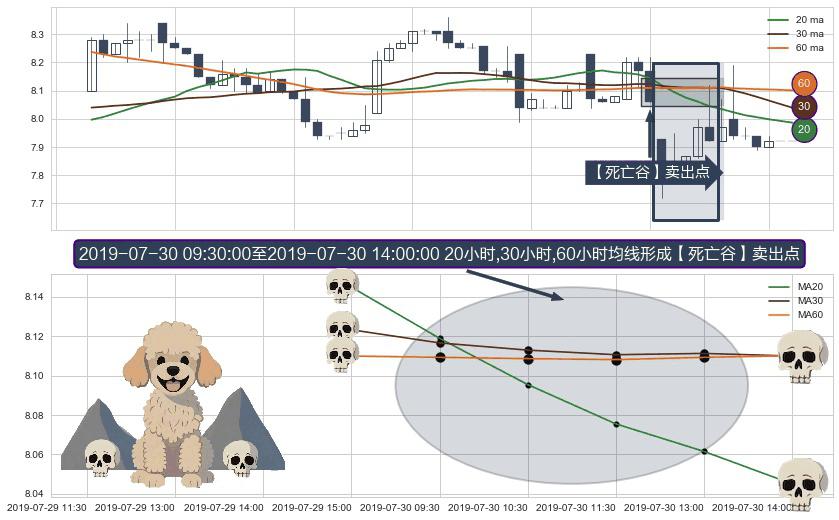 形态多维评估: ⚀ 2019-07-30 10:30:00-小时至2019-07-30 14:00:00-小时显现 20小时-30小时-60小时均线 【死亡谷】卖出点 看空信号,后市看跌,卖出