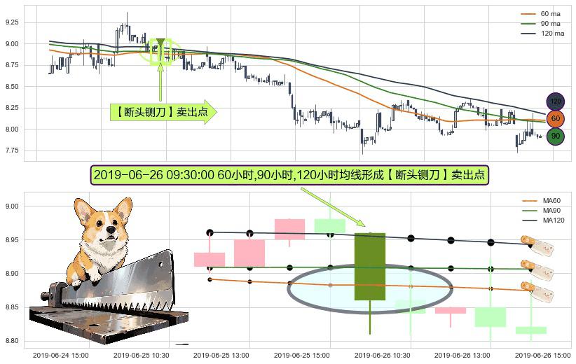 形态多维评估: ⚀ 2019-06-26 09:30:00小时显现 60小时-90小时-120小时均线 【断头铡刀】卖出点 看空信号,后市看跌,卖出