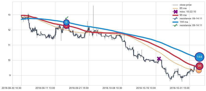 下跌趋势04-08 13:00-06-12 09:30,均线144, 95确认关键阻力2处