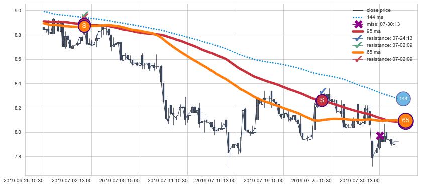 下跌趋势06-26 10:30-07-31 15:00,均线65, 95确认关键阻力2处