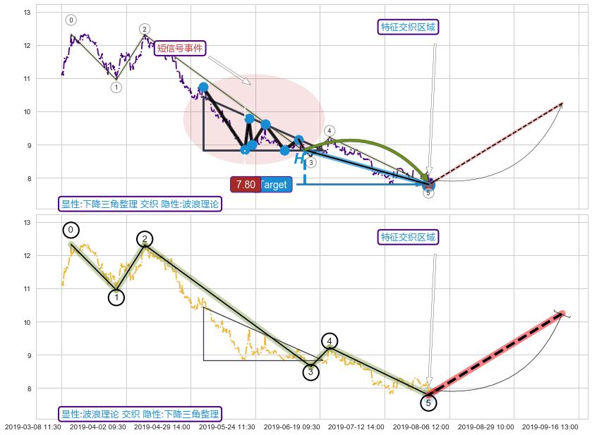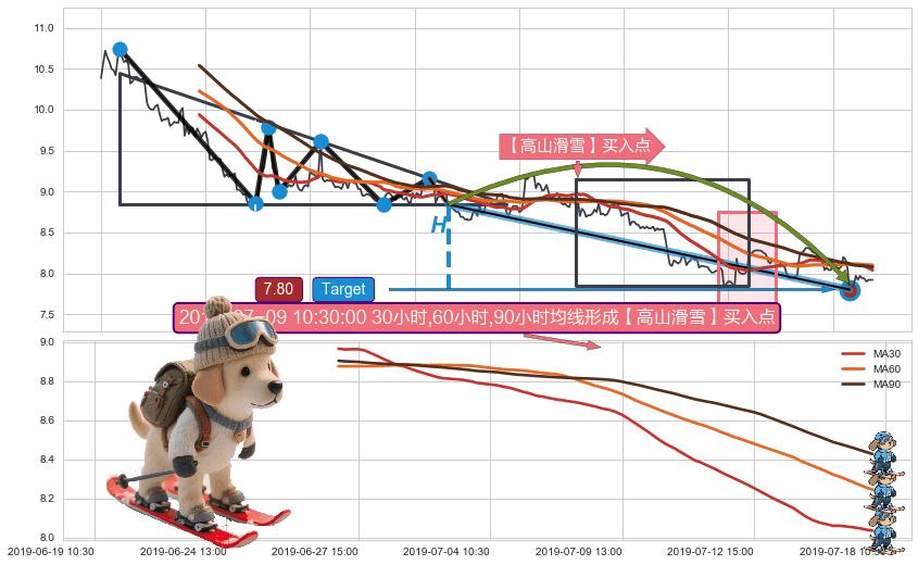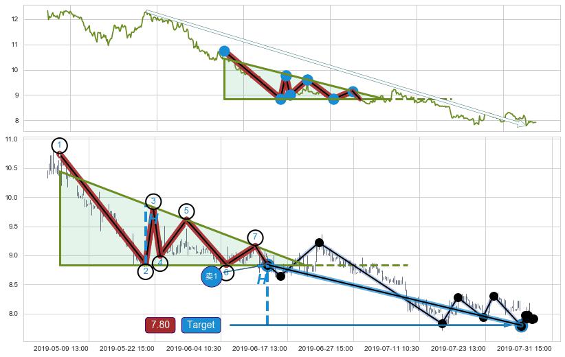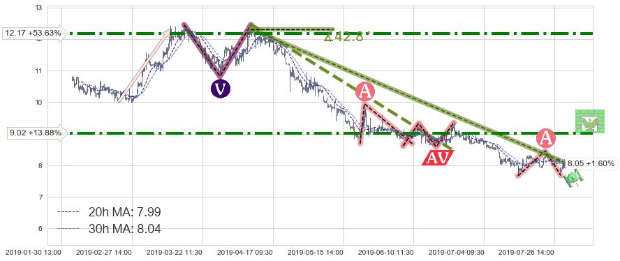 🦴 长线均值回复组合短线趋势跟踪[强阻力信号]2019-04-09 15:00-2019-07-31 15:00下跌趋势依然成立(下跌趋势跟踪依然存在),短线价格略微上行反弹(均值回复猜想),即将接近下跌趋势提供的未破位阻力价格:8.05。