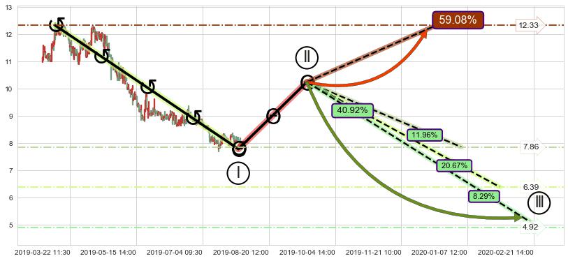 从2019-02-04 09:30至2019-03-12 15:00,共包含141个小时,阶段股价上涨13.90%,阶段股价变动位移路程比: 1 : 6