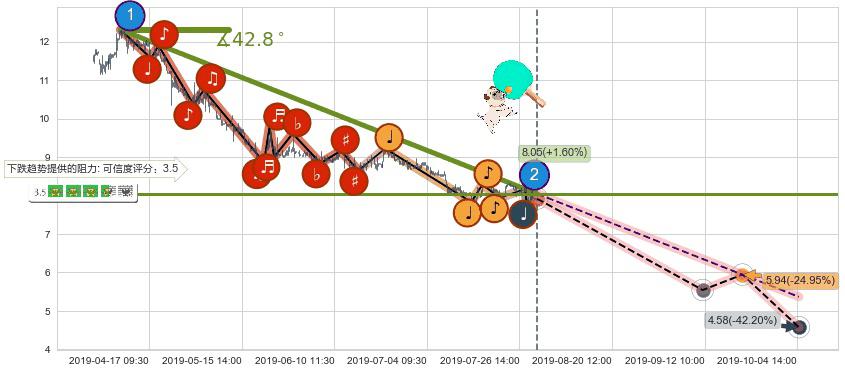 从2019-04-09 15:00至2019-07-31 15:00,共包含451个小时,阶段股价下跌-41.99%,阶段股价变动位移路程比: 1 : 6,下跌趋势角度: 42.8