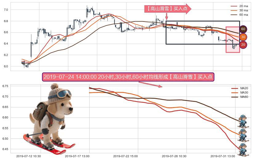 形态多维评估: ⚀ 2019-07-17 13:00:00小时-2019-07-31 15:00:00小时显现 20小时-30小时-60小时均线 【高山滑雪】买入点 看多信号,后市看涨,买入