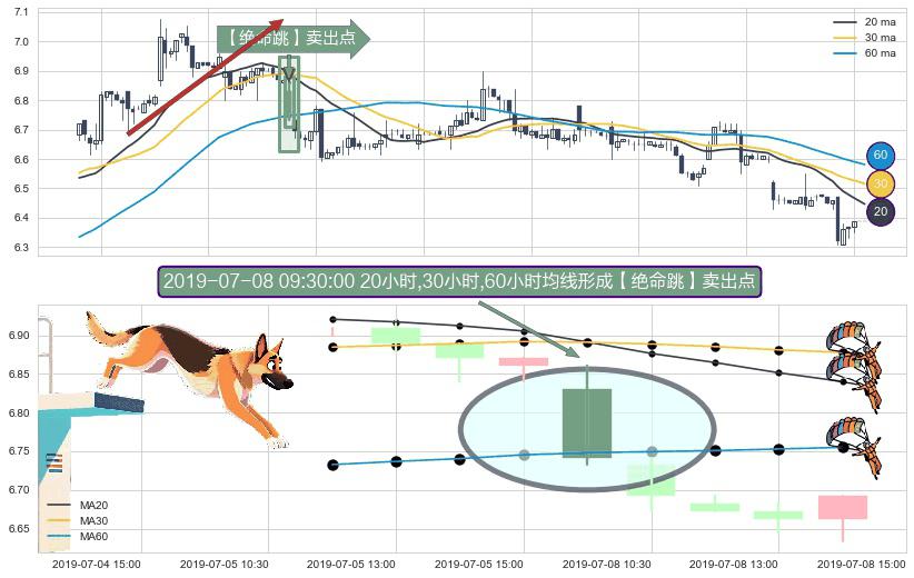 形态多维评估: ⚀ 2019-07-08 09:30:00小时显现 20小时-30小时-60小时均线 【绝命跳】卖出点 看空信号,后市看跌,卖出
