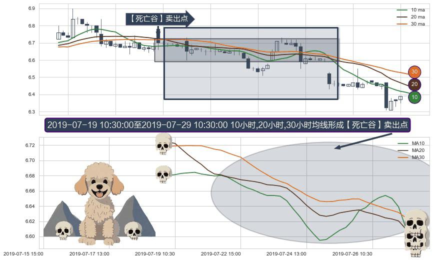 形态多维评估: ⚀ 2019-07-19 11:30:00-小时至2019-07-29 10:30:00-小时显现 10小时-20小时-30小时均线 【死亡谷】卖出点 看空信号,后市看跌,卖出