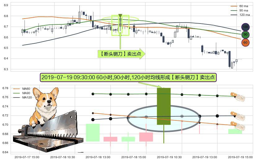 形态多维评估: ⚀ 2019-07-19 09:30:00小时显现 60小时-90小时-120小时均线 【断头铡刀】卖出点 看空信号,后市看跌,卖出