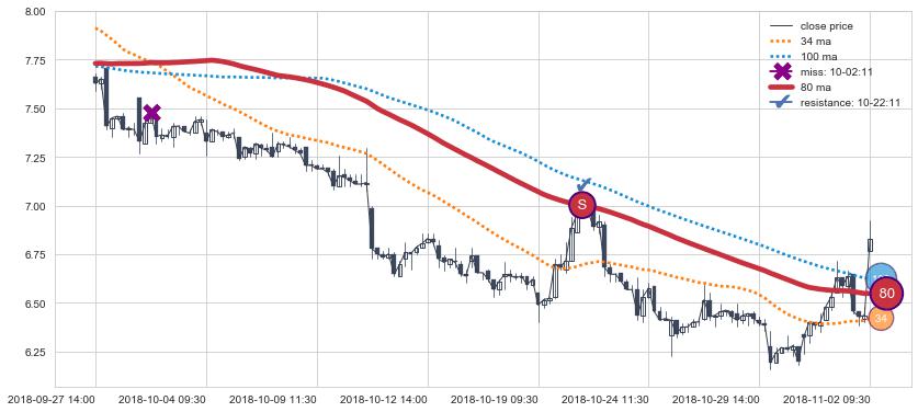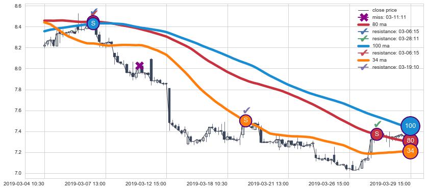 下跌趋势03-04 10:30-03-29 15:00,均线80, 34, 100确认关键阻力3处