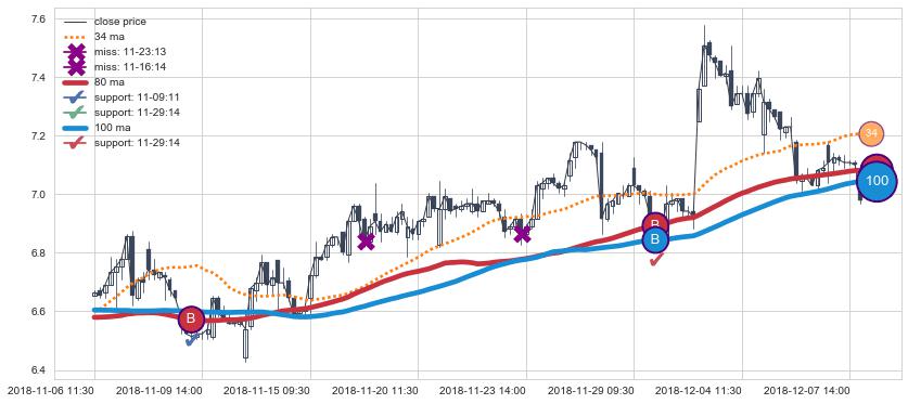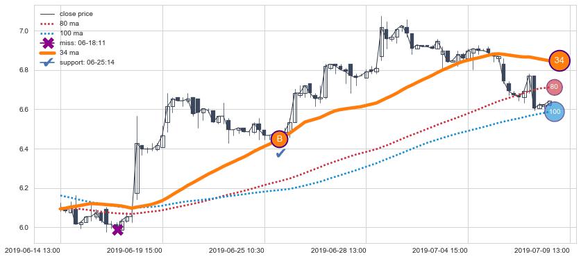 上涨趋势06-14 13:00-07-09 13:00,均线34确认关键支撑1处