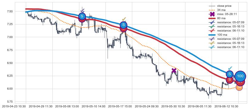 下跌趋势04-23 10:30-06-12 10:30,均线80, 100确认关键阻力3处