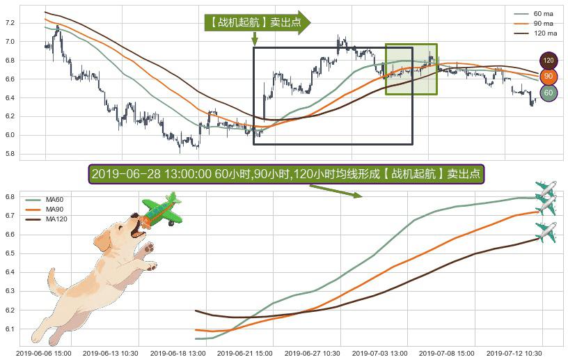 形态多维评估: ⚀ 2019-06-18 09:30:00小时-2019-07-12 09:30:00小时显现 60小时-90小时-120小时均线 【战机起航】卖出点 看空信号,后市看跌,卖出